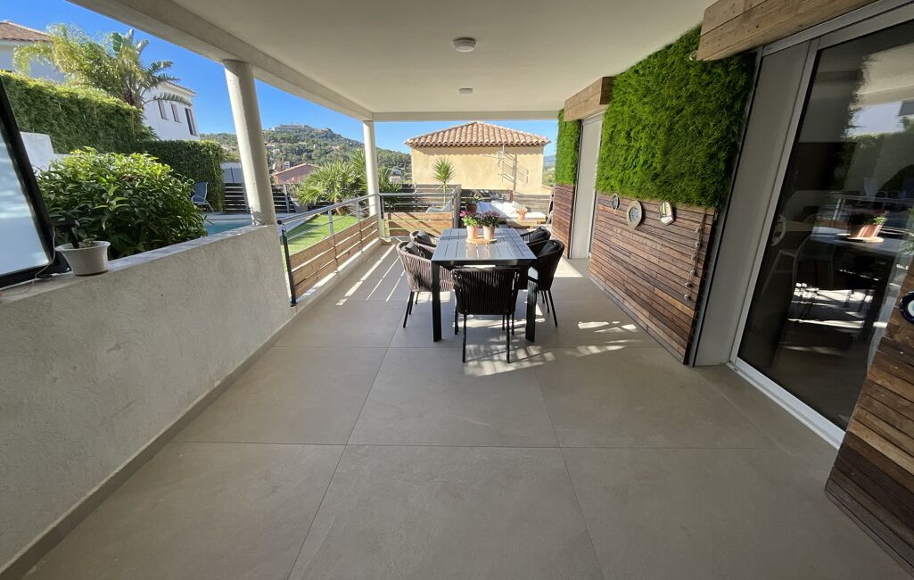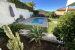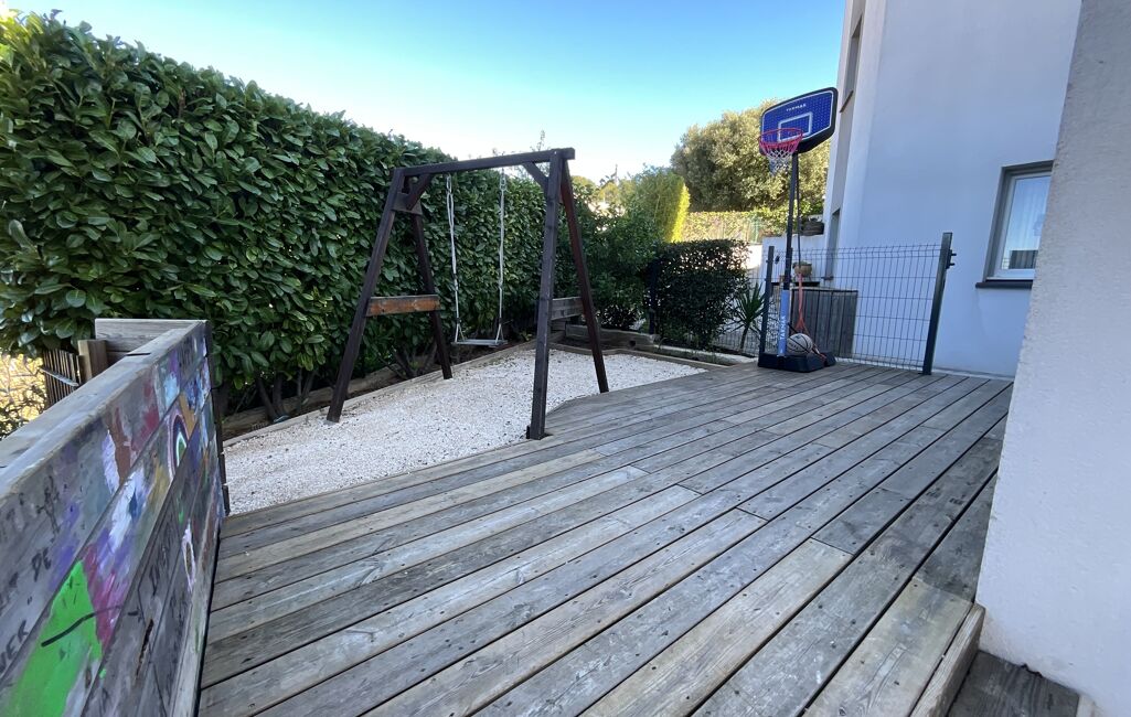 Concernant les extérieurs, tout est impeccable. Le jardin, qui fait le tour de l'habitation, est très bien entretenu et il est arboré avec de la végétation méditerranéenne. Notons la présence d'espaces de jeux pour les enfants ainsi qu'un cabanon pouvant servir d'ateliers ou d'espace de rangement. L'appartement possède une jolie et grande terrasse couverte pouvant accueillir de grandes tablées qui donne directement sur le jardin et l'espace piscine.