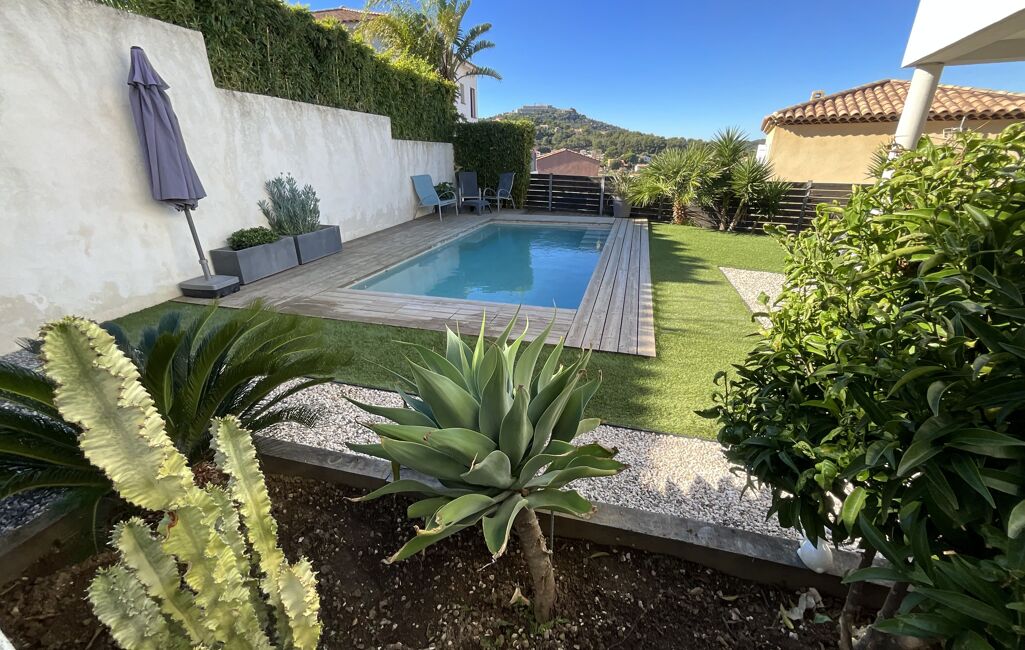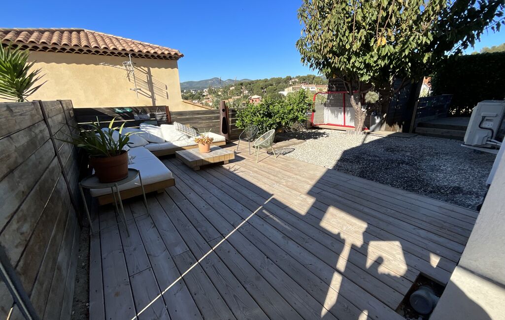 Votre agence Exposition Sud Immobilier vous propose en exclusivité sur les hauteurs de Barban/la Colle d'Artaud à la Seyne sur mer, dans un environnement résidentiel et au calme absolu offrant une vue dégagée sur les alentours et, entre autre le fort de Six Fours, cet appartement 4 pièces de 90 m² de 2013 en bas de villa avec terrasses, jardin et piscine.
