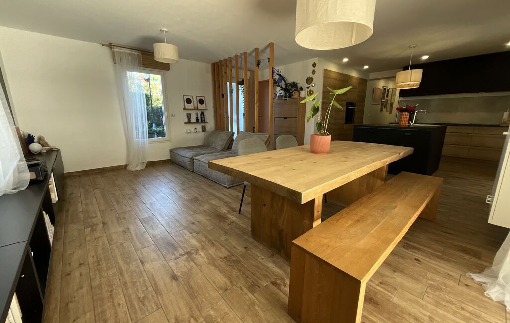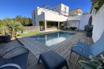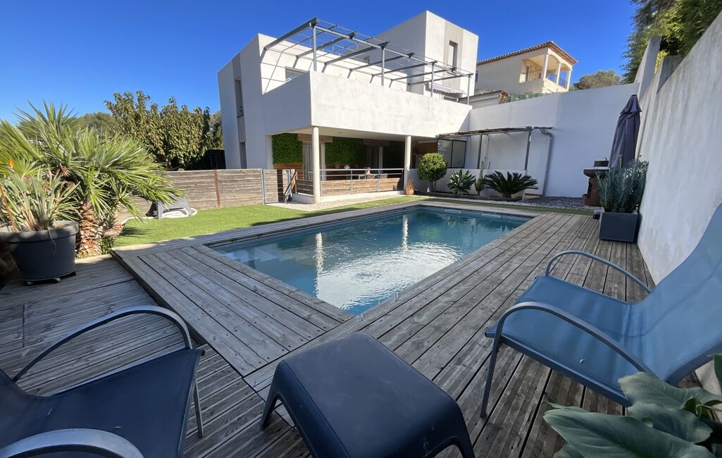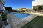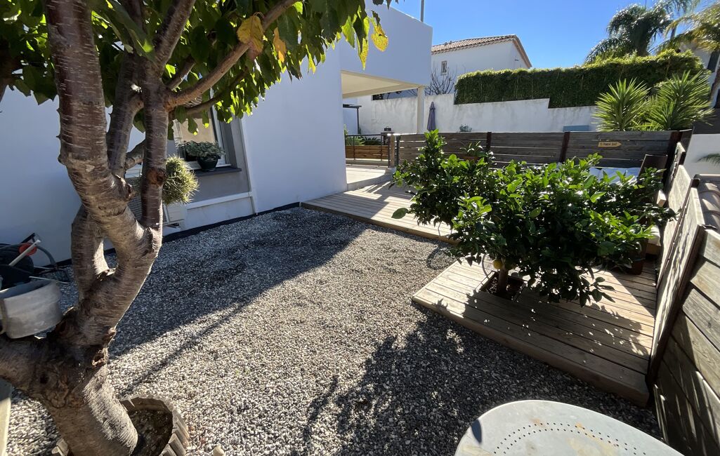 Concernant les extérieurs, tout est impeccable. Le jardin, qui fait le tour de l'habitation, est très bien entretenu et il est arboré avec de la végétation méditerranéenne. Notons la présence d'espaces de jeux pour les enfants ainsi qu'un cabanon pouvant servir d'ateliers ou d'espace de rangement. L'appartement possède une jolie et grande terrasse couverte pouvant accueillir de grandes tablées qui donne directement sur le jardin et l'espace piscine.