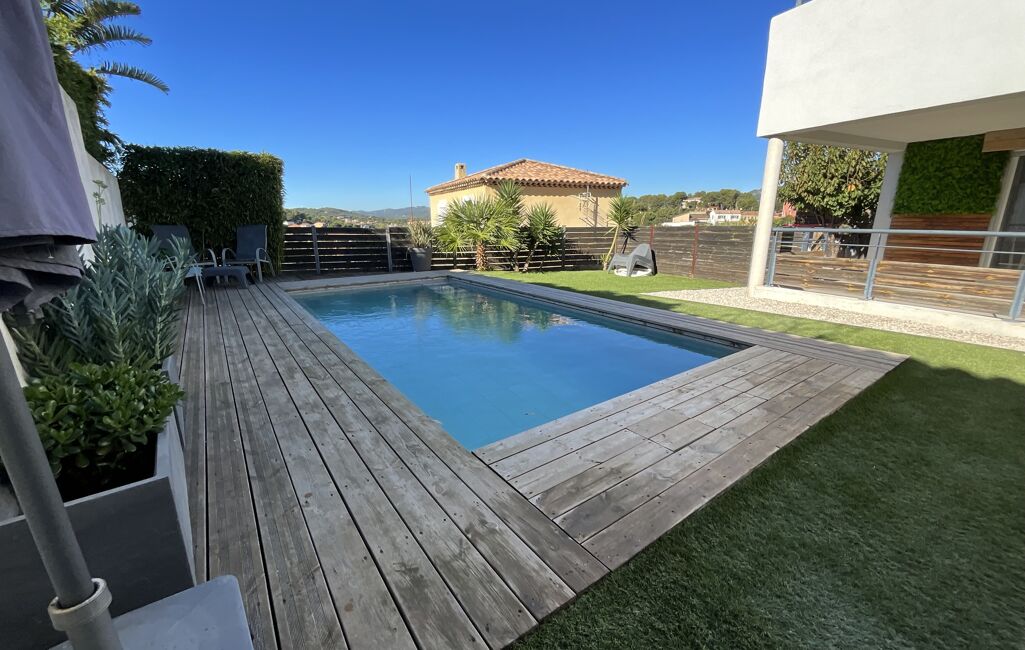 Votre agence Exposition Sud Immobilier vous propose en exclusivité sur les hauteurs de Barban/la Colle d'Artaud à la Seyne sur mer, dans un environnement résidentiel et au calme absolu offrant une vue dégagée sur les alentours et, entre autre le fort de Six Fours, cet appartement 4 pièces de 90 m² de 2013 en bas de villa avec terrasses, jardin et piscine.